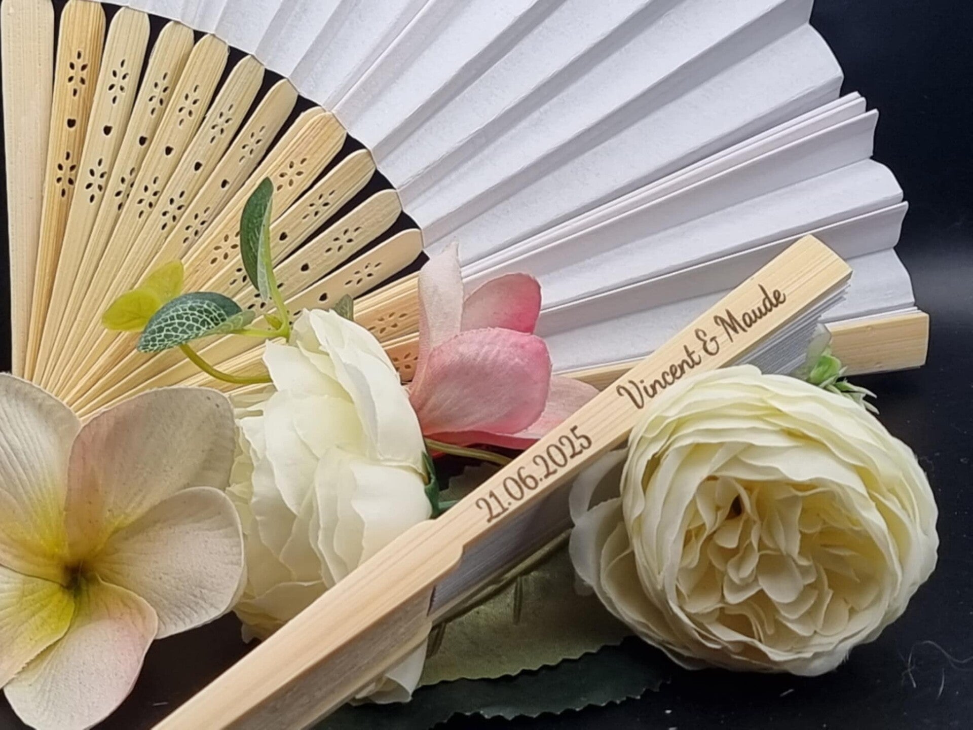 L'éventail, symbole de raffinement, est un accessoire qui peut être utilisé lors de la cérémonie ou de la réception. En choisissant de le personnaliser avec une gravure au laser, vous offrez aux invités un souvenir durable et significatif. Que ce soit les initiales des époux, la date du mariage ou un message touchant, la gravure au laser permet de créer un design sur mesure qui reflète l'amour et l'engagement des mariés. Emballée dans un petit sac de toile et un carton de remerciements.